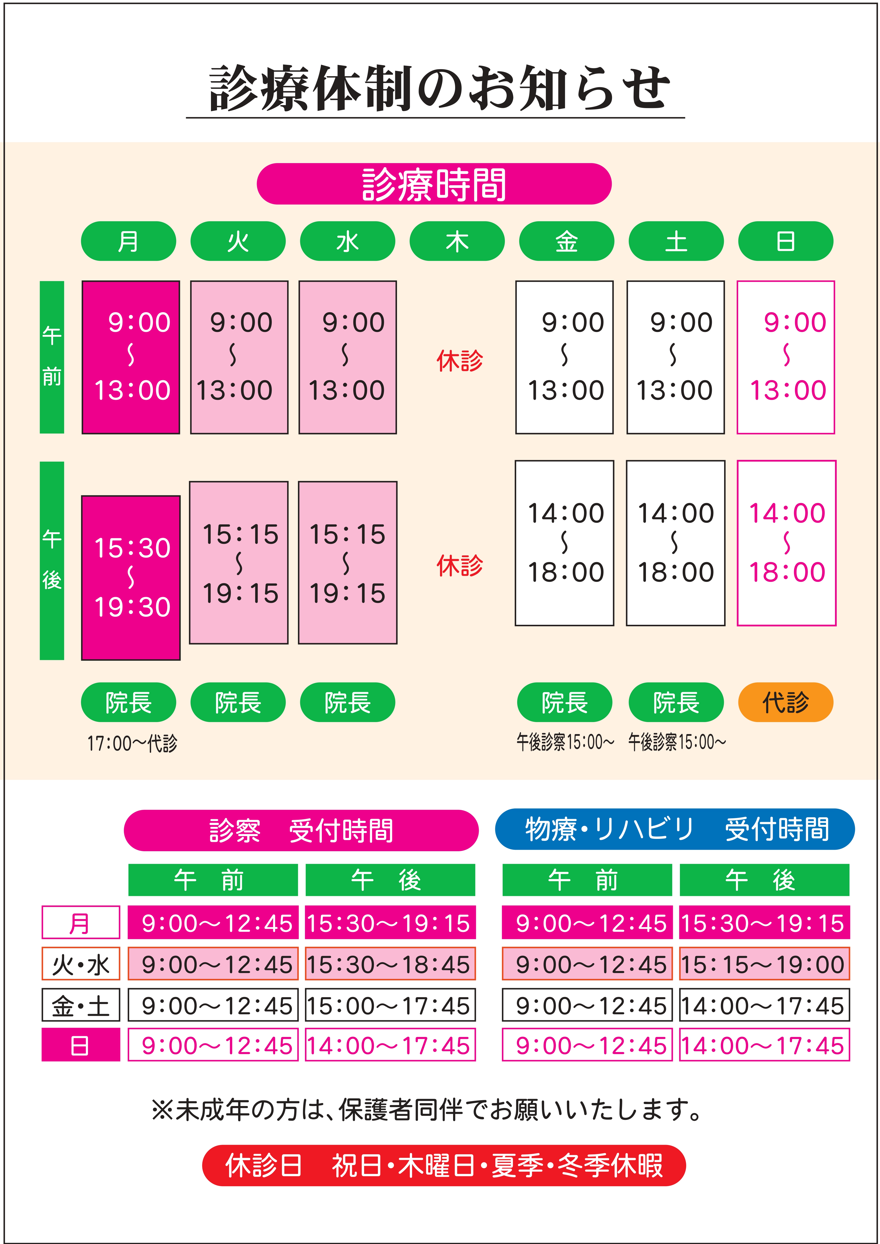 ・必要な連絡が取れない場合や治療の内容により、医師の判断で後日改めて保護者(代理人)と同伴で受診をお願いする場合がございます。